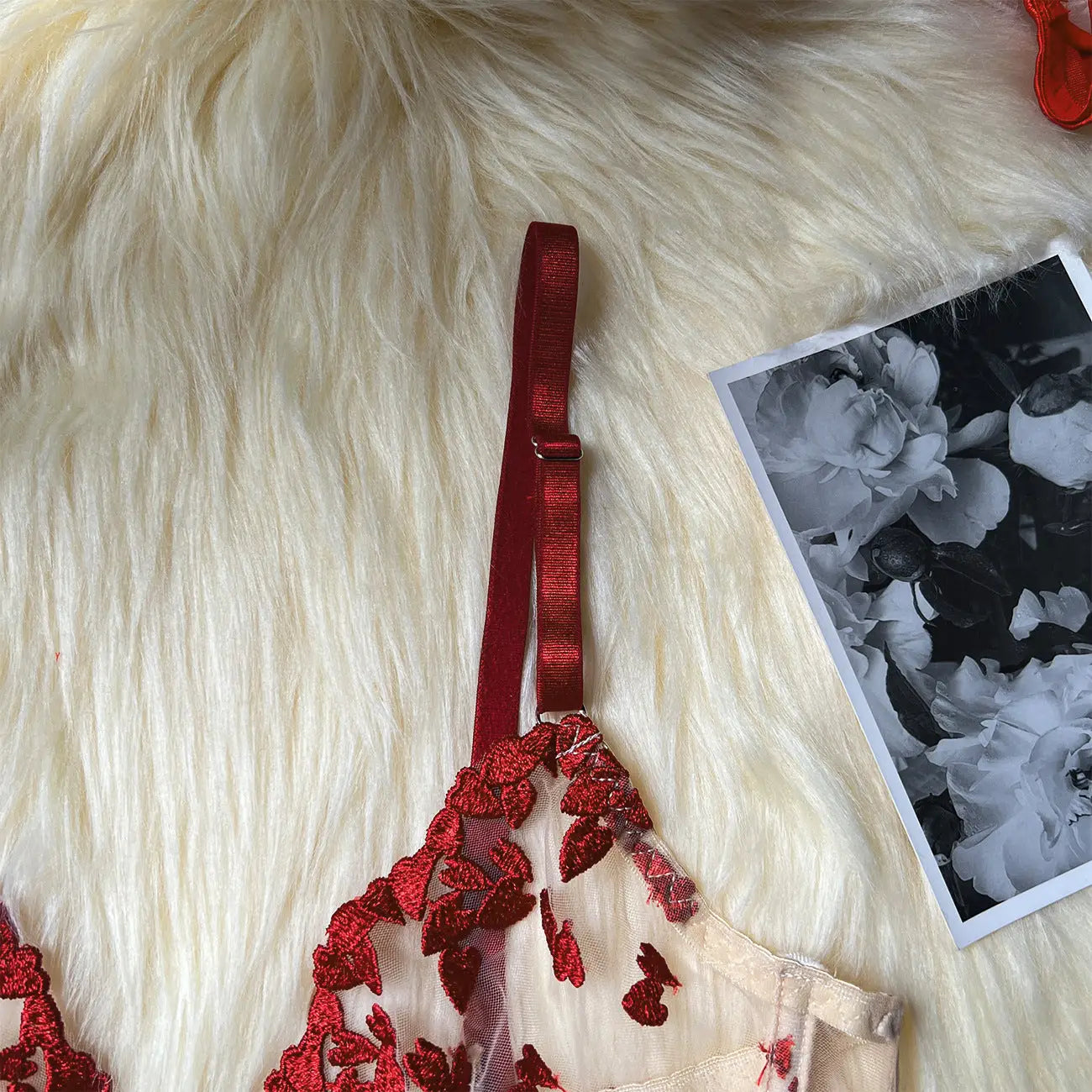 This embroidered lingerie set is meticulously crafted for high-end appeal. The vibrant red floral embroidery offers a tantalizing contrast against the skin, while fully adjustable straps ensure a bespoke fit that feels as incredible as it looks. It's the perfect luxury lingerie for an anniversary or any special occasion demanding an extra touch of passion.